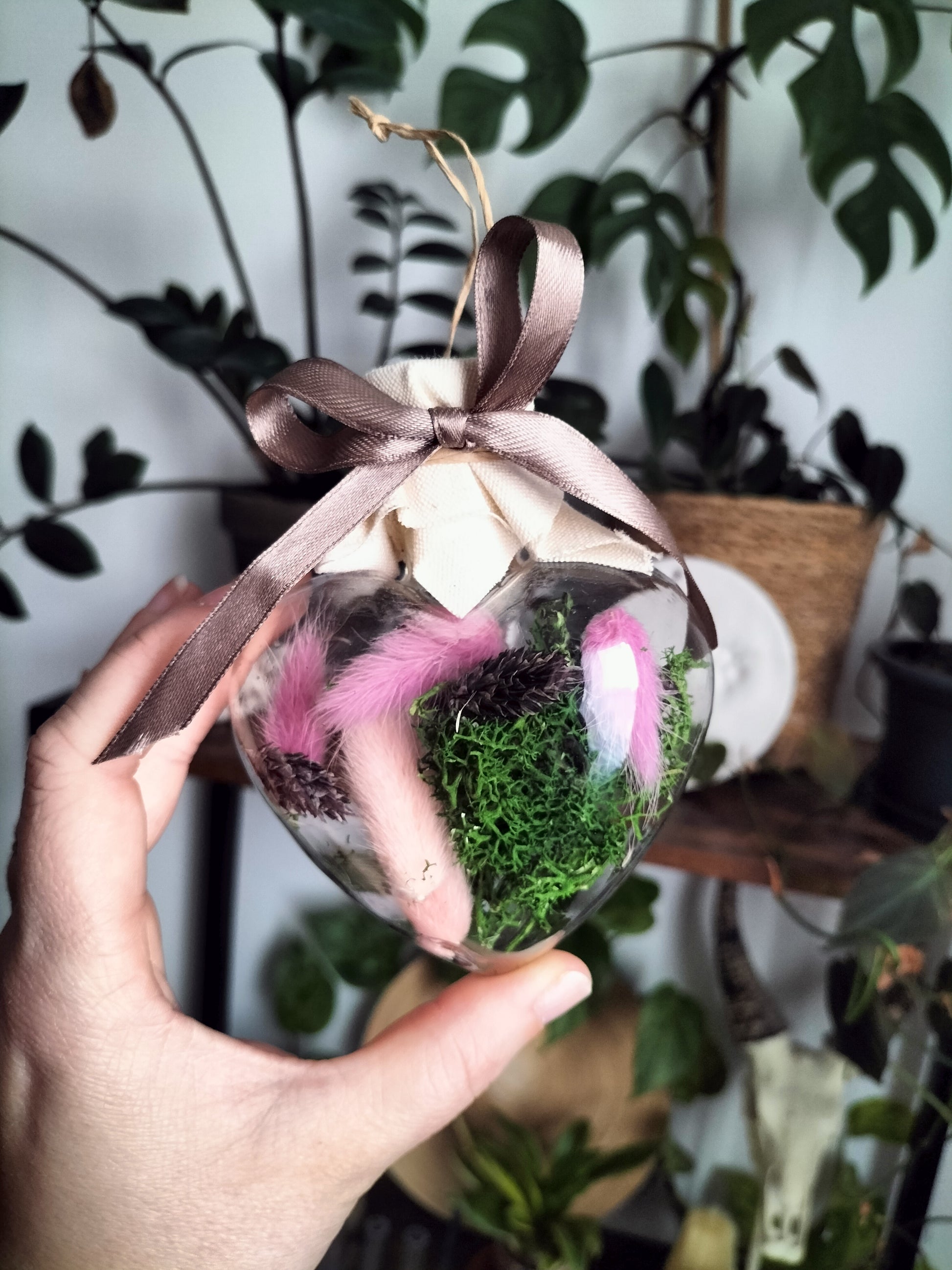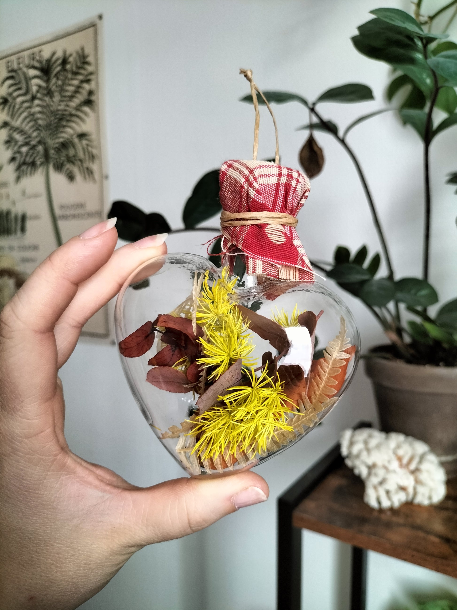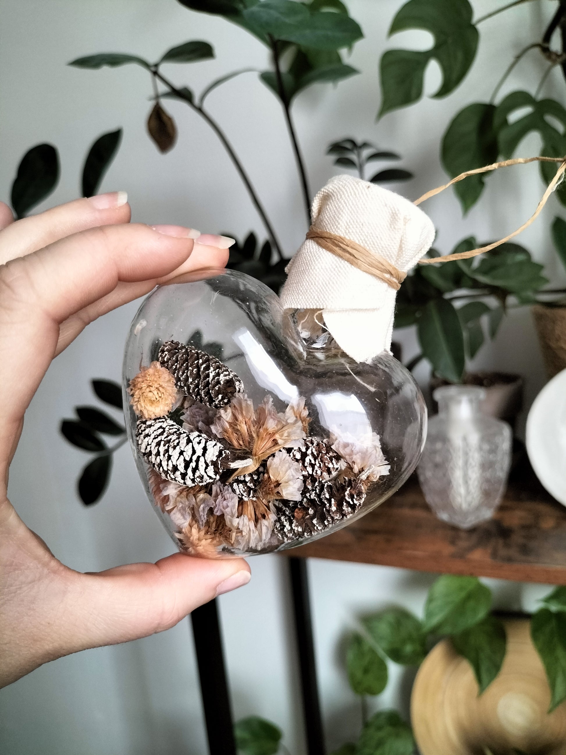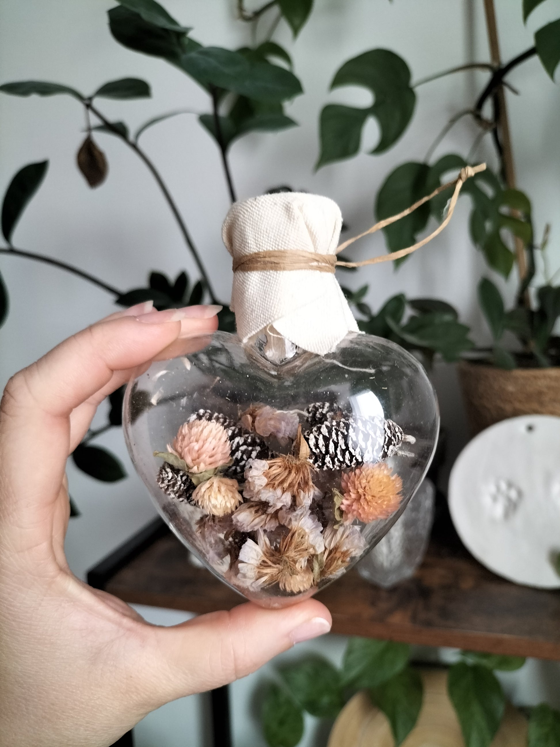 Fiole en verre soufflé en forme de coeur, garnie de fleurs séchées et fermée avec du tissu de seconde main.